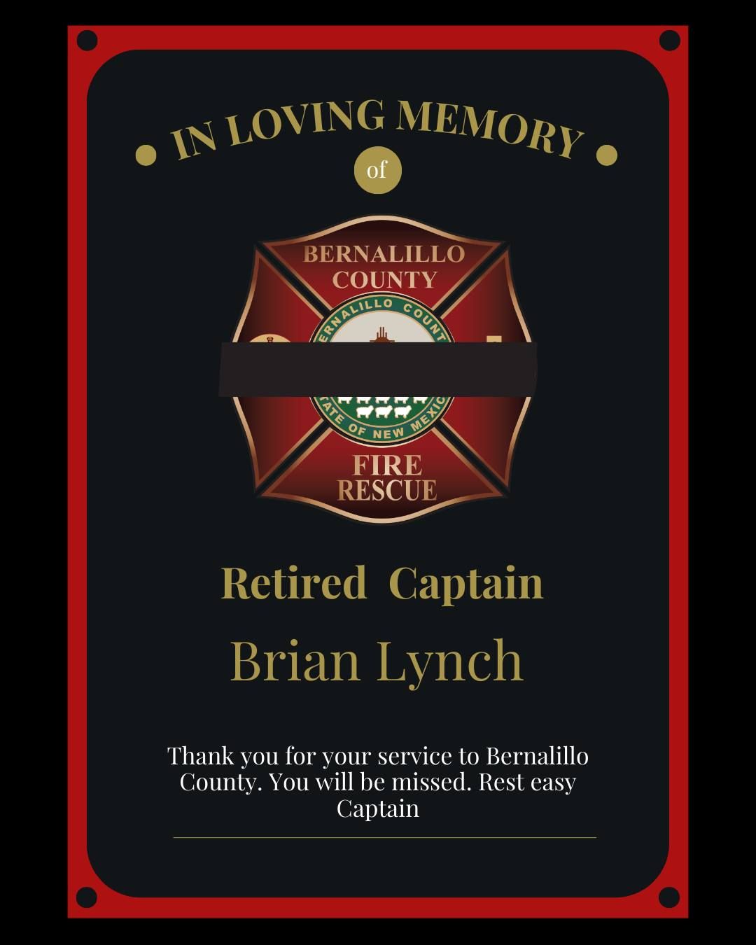 Captain Lynch was a Retired Captain with Bernalillo County Fire and Rescue, a member of the Albuquerque Area Firefighters IAFF Local 244, and a Flight Paramedic with the University of New Mexico Hospital Lifeguard. He passed away in Texas, and upon his arrival in Albuquerque, he was met with full firefighter honors.