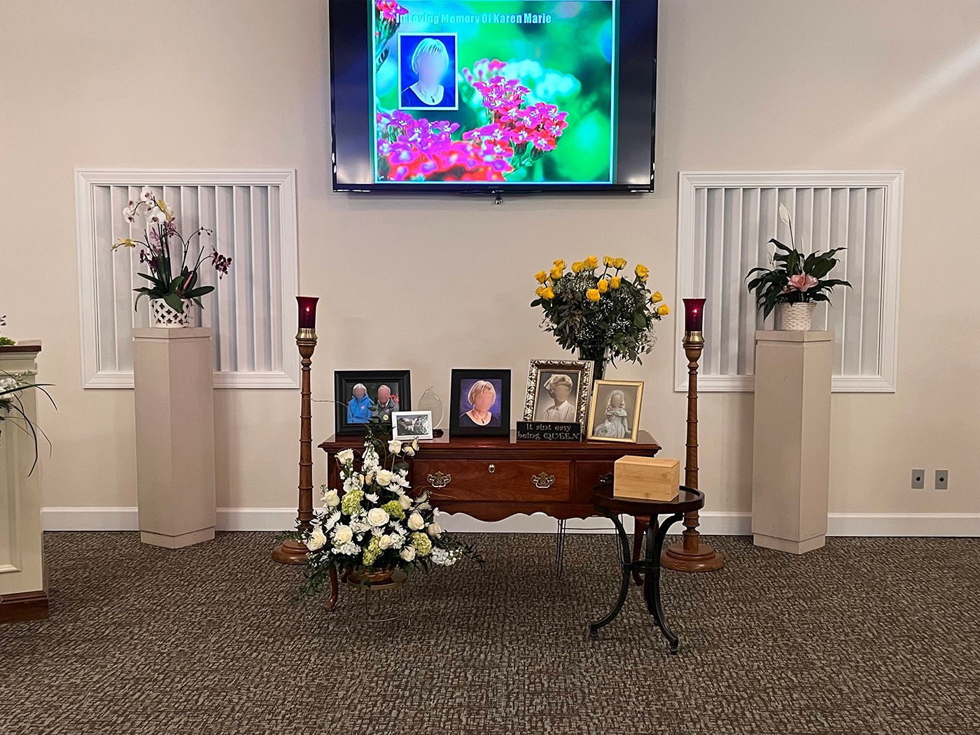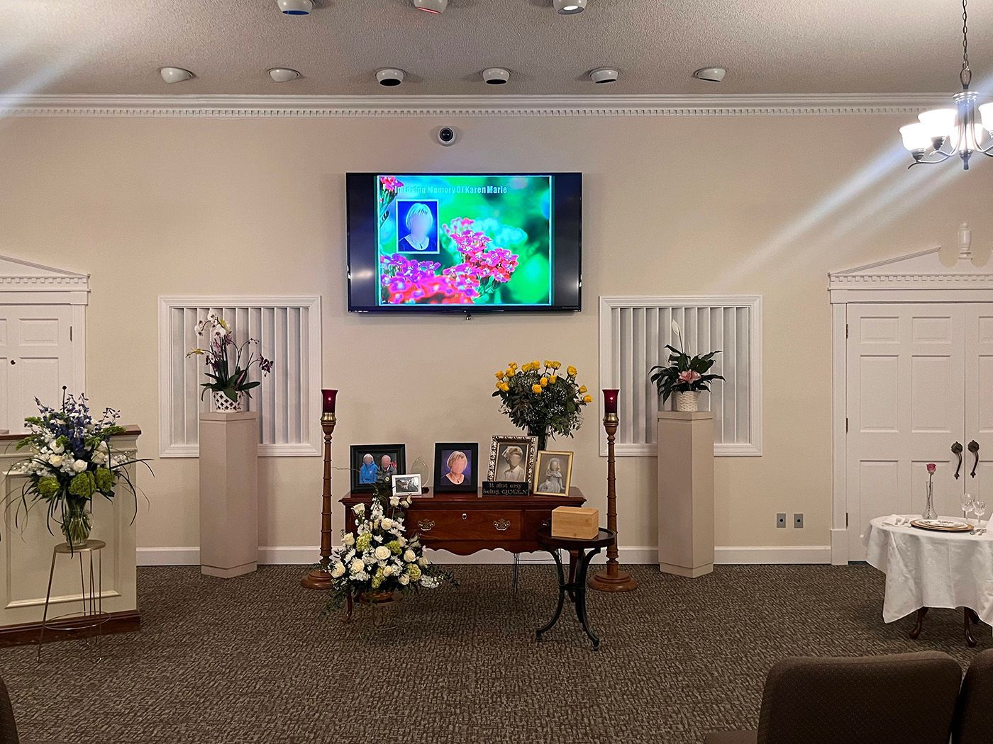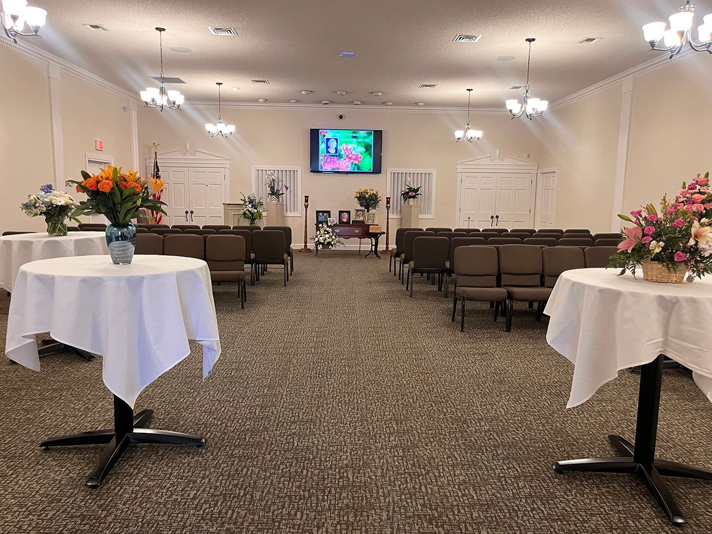 Our event room can comfortably accommodate gatherings of various sizes. Whether planning a small, intimate ceremony or a larger celebration, we ensure the space is perfect for every family's needs. We can customize video tributes and personalized printed materials through our partnership with Life Celebrations.